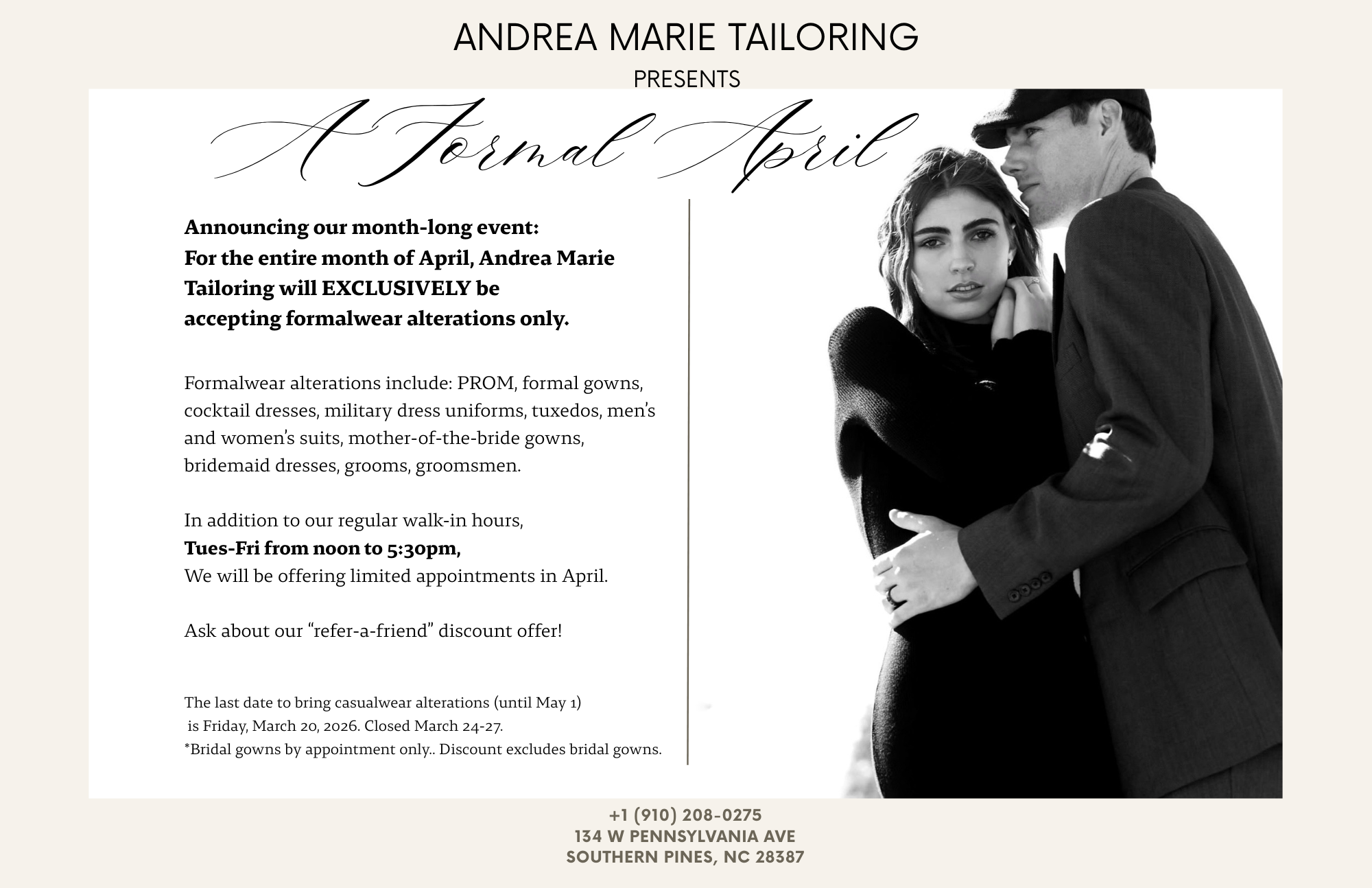 Andrea Marie Tailoring is a full service walk-in clothing alterations studio located in downtown Southern Pines, NC. With over 30 years of experience, Andrea and her skilled team offer a wide range of sewing services in bridal, men’s and women’s formalwear, military uniforms, denim repair, bespoke clothing and more. Tues-Fri from noon-5:30pm